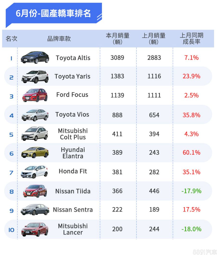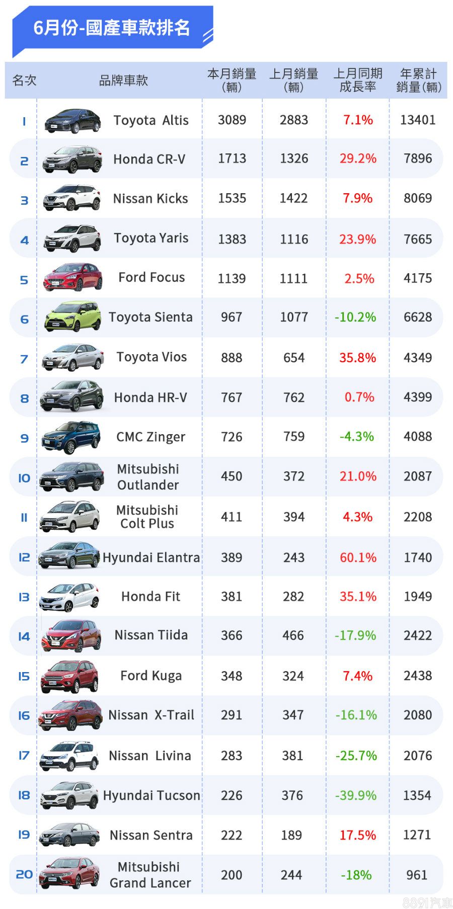 6月份國產車款排名方面,神車Altis地位無法撼動,在第三個完整銷售月份,二度銷量破三千,Ford Focus、Honda雙雄CR-V、HR-V銷量上漲,連帶帶動品牌整體表現。