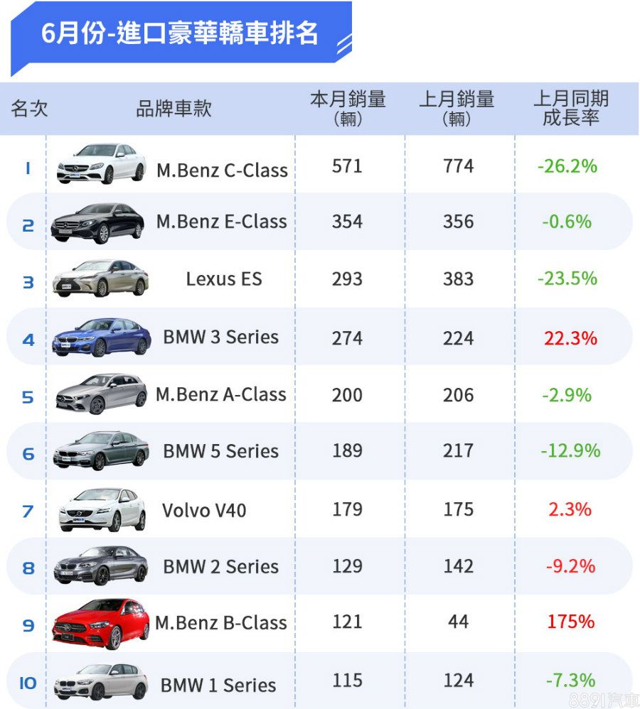 Mazda在持續受到新Mazda 3新舊交替期,以及CX-3、CX-5銷量衰退後,6月稍微止跌回升,賓士則為總市場榜上銷量唯一負成長的進口品牌,這點自旗下車款銷售數字亦可明顯察覺。