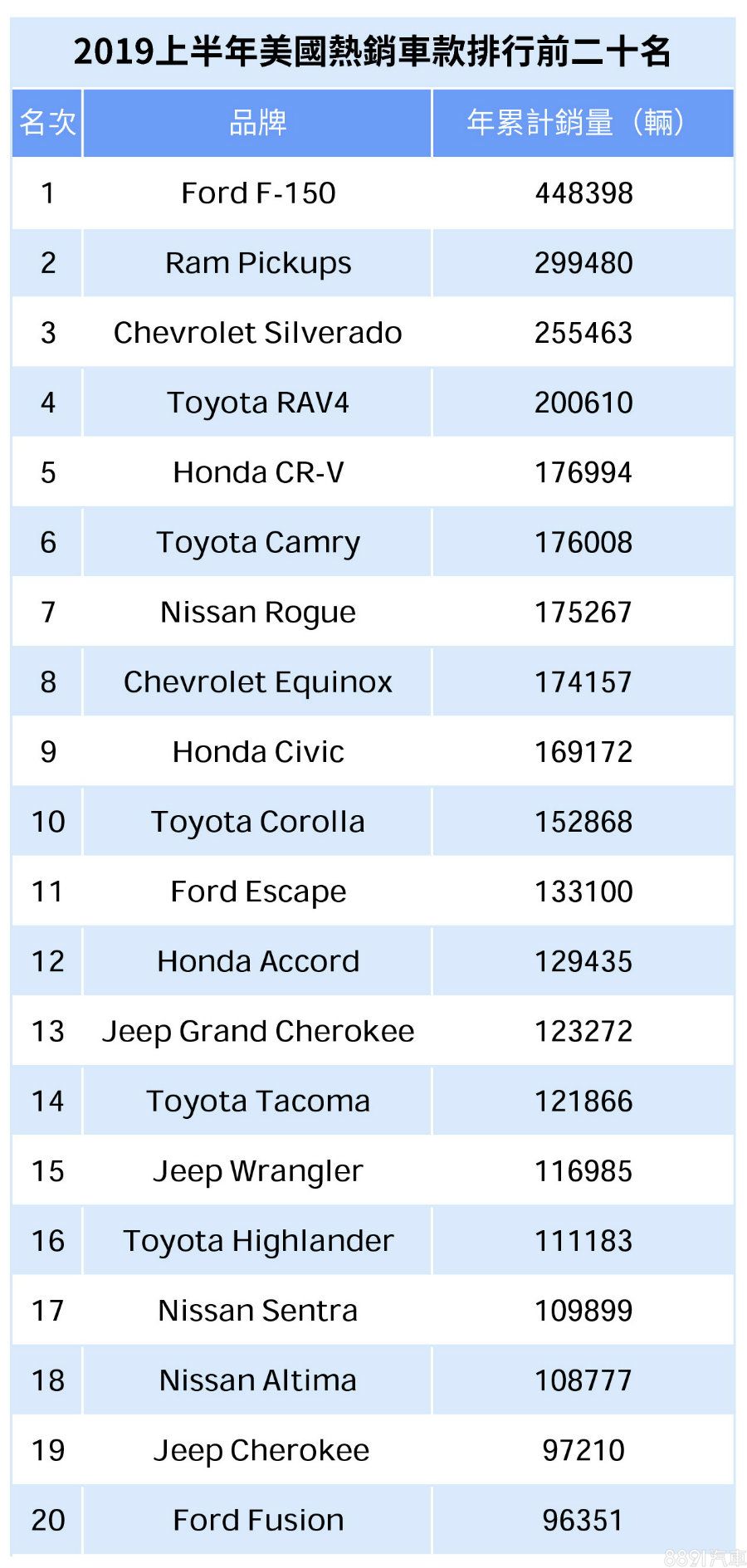 還有其他不少國內熟知的車款也上榜,如排名第十的Toyota Corolla、第十一的Ford Escape(台灣稱Kuga),以及第十八名、國內預計今年導入的Nissan Altima等,一起來看看美國2019上半年度熱銷車款前二十名有哪些吧!