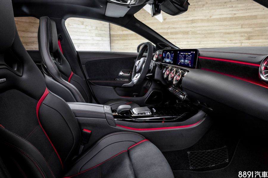 內裝部分,CLA 45 Shooting Brake雖維持NGCC的家族性設計,但更講究競技風格的營造,不僅於方向盤、車門飾板均以人造麂皮包覆,也換上了包覆性更扎實的運動化座椅,而原廠釋出的示範車款更選用紅黑雙色的強烈對比來營造氛圍!