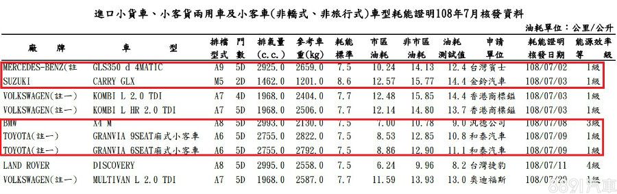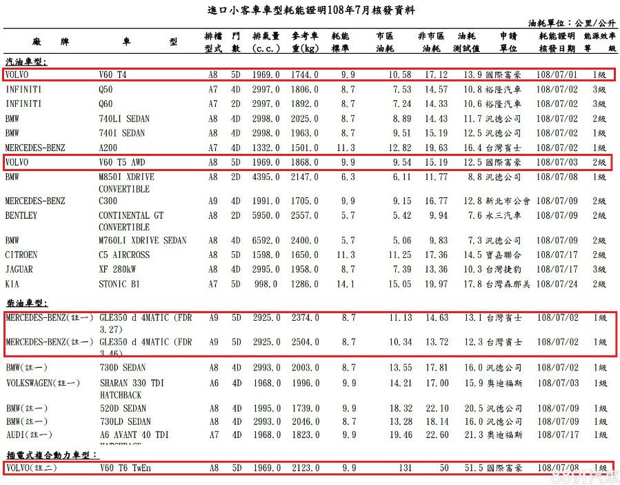 甫於7/26在台上市的二代V60,提供帶來T4、T5、T6 三種動力,此回也一併現身於2019年7月能源局油耗數據,此外,尚有6月底在台發表的M.Benz新一代GLE 350 d五人座與七人座車型。