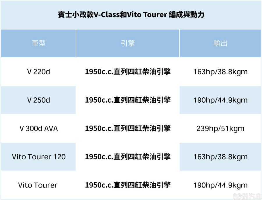 在動力上小改款後的V-Class以及Vito Tourer車系更為精進,原先代號OM651、2143 c.c.柴力動力引擎已被淘汰,換上了代號OM654、排氣量為1950 c.c.的直列四缸柴油引擎。
