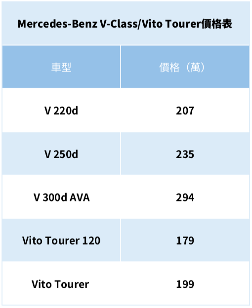 全車系改款過後價格有些許的調整,新增了V 300d AVA新車型,且有6~8人不等的座位配置,能夠滿足商務需求或者是家庭出遊使用。