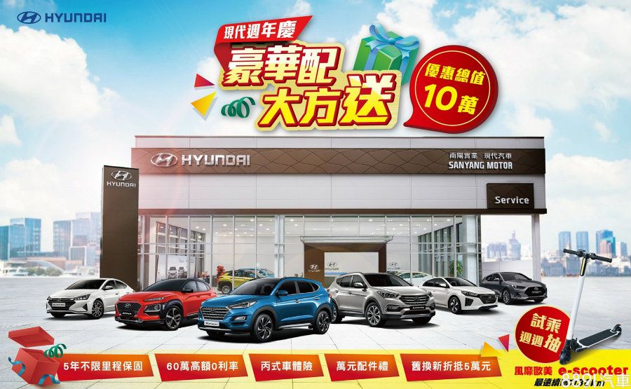 本月Hyundai展開週年慶活動,即日起至11/30止,入主Elantra、Tucson以及Santa Fe等指定車款,原廠將提供「丙式車險」、「萬元配件禮」、「舊換新5萬元補助」、「60萬0利率分期」以及「5年不限里程保固」等優惠,加上各車款專屬促銷方案,總價值逾10萬。