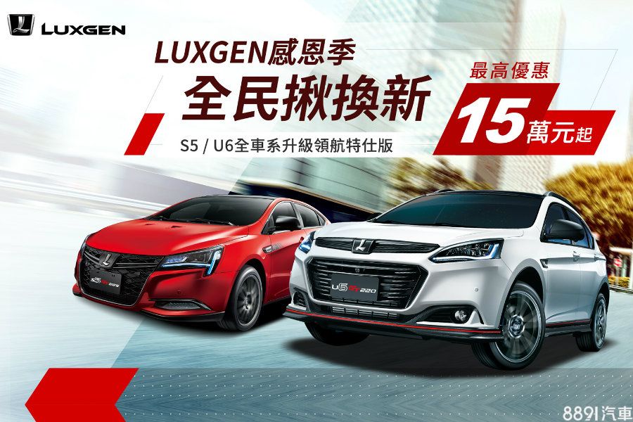 Luxgen推出「全民揪換新」優惠方案,自11/1~11/29止,只要入主U6 GT、S5 GT等車系,就可享價值5萬元起升級領航特仕與購車金5萬元,搭配舊換新5萬元補助,優惠最高15萬元起。除此之外,原廠專案還提供萬元紅利金與「全車5年或14萬公里保固」,若完成交車領牌,再贈「6年6大系統及前瞻系統不限里程延長保固」。