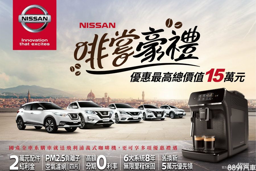 購車還能喝咖啡?本月Nissan推出「啡嘗豪禮」優惠方案,即日起至11/29,凡入主品牌國產全車系或Juke並完成領牌,立刻贈送Philips自動義式咖啡機(乙台),不僅如此,還有2萬元配件紅利金等5項好禮,優惠最高價值達15萬!