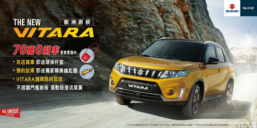 本月Hondq全新優惠正式開跑,活動期間來店賞車,不僅贈送環保杯套,參與試乘再送專屬車款鑰匙圈。除此之外,月底前購入Vitara並完成領牌,原廠除提供「70萬0利率」,還加贈「運動風擾流尾翼」及「專屬迎賓門檻飾板」。