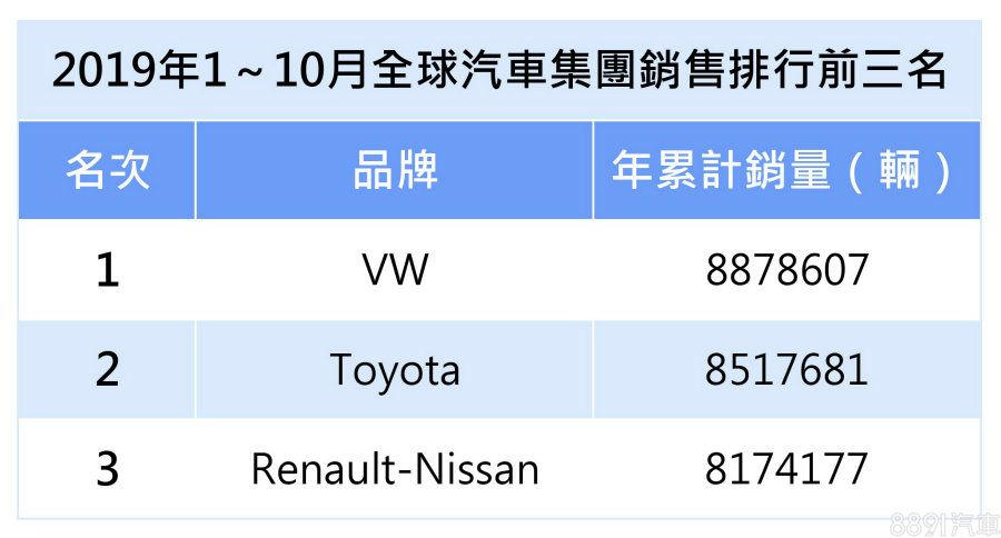 VW集團蟬聯了2016、2017、2018年的集團銷售王寶座,2019年1~10月也處於領先狀態,不過前三名中,僅有Toyota集團在銷售數據上呈現正成長,順帶一提,由於各家都會公布自家年度銷售數據,有時會和市調機構統計不盡相同,也會出現集團宣稱「我才是全球第一」的情況。
