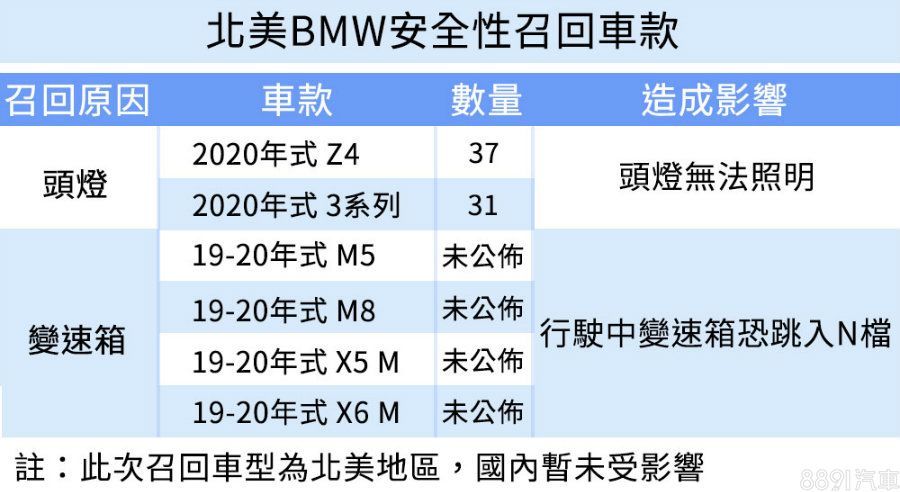 而在上述召回發佈不久後,BMW部份M車款也因為變速箱問題暫停販售,雖說BMW已經主動向NHTSA發佈通報,但詳細影響範圍尚未公佈,僅得知相關車款尚未對外販售,包含M5、M8、X5 M以及X6 M。