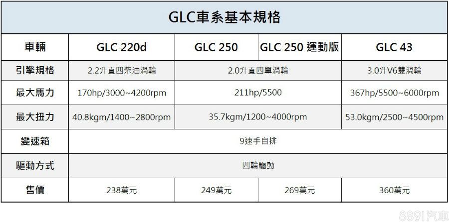 追加GLC 43後,車系共三款動力供選擇,其中主力的GLC 250則再細分為兩種版本,至於最高等級的GLC 63,也預計在2018年上半加入陣容。