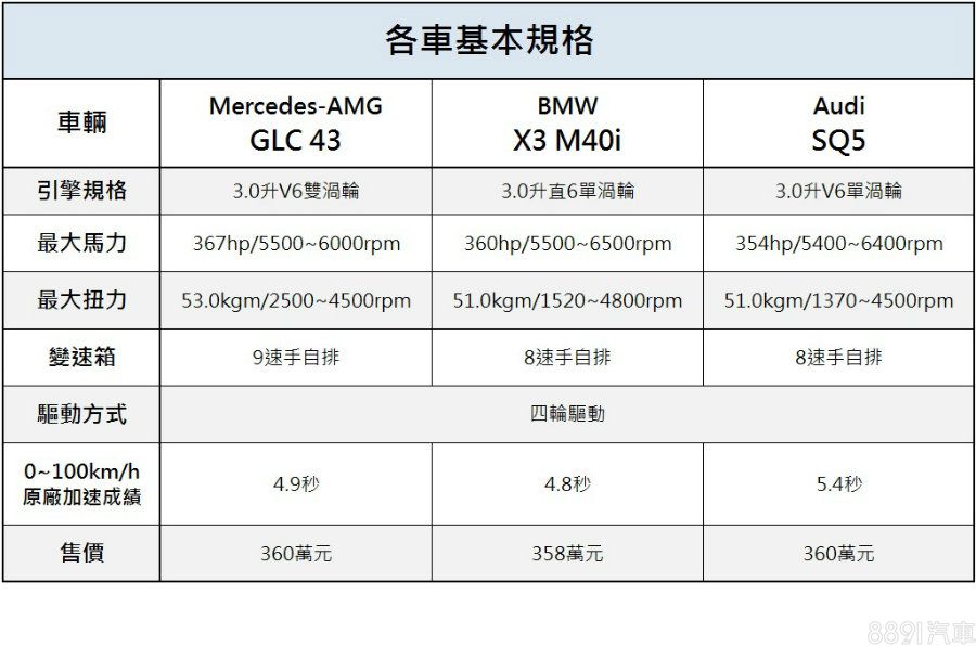 SQ5也是GLC43、X3 M40i的直接對手,價格與GLC43同為360萬,SQ5採3.0升V6單渦輪引擎,輸出為354hp/54.0kgm,從帳面數據來看,SQ5是三車馬力最小,但扭力卻最大。