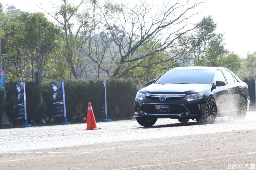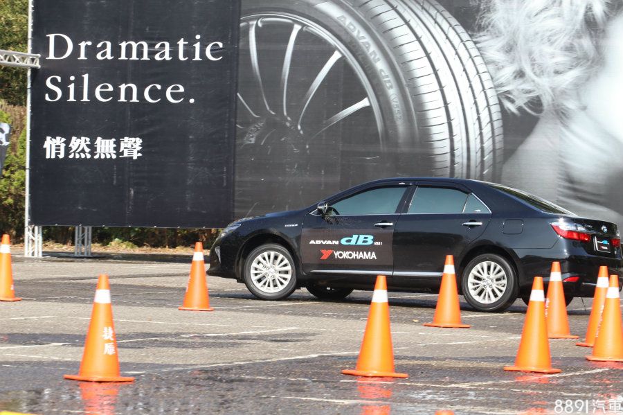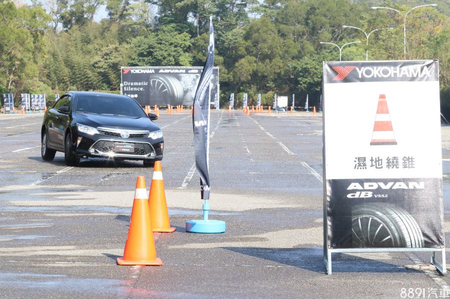 在第一項濕地繞錐與繞圓測試關卡部分,出發先行繞錐一趟之後,進入繞圓關卡行進三圈,隨後再原路繞錐回程,並統一以Toyota Camry Hybrid為測試車款,搭配215/55R17尺寸的V551與V552進行前後對比,測試其濕地操駕表現。