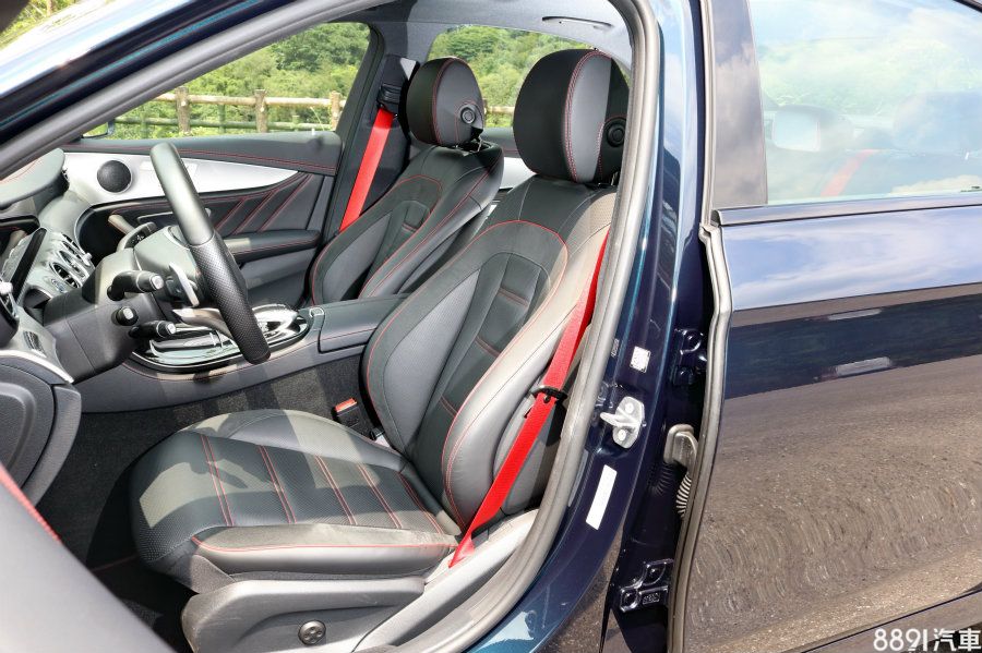 座椅採真皮與麂皮材質包覆,不過防滑效果佳的麂皮部份,並非分布在常見的背部與臀部區域,實際感受和紅色車縫線與安全帶一樣是為了營造跑格,此外,強烈建議E43車主可選配AMG賽車造型座椅,要價17萬,但加分效果值得。