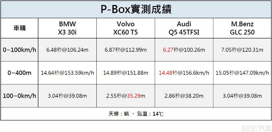 雖然快慢並非此回重點,但還是能透過同場實測,進而比較各車全力加速下的能耐,當中以Q5 45TFSI拔得頭籌,0~100km/h加速得到最佳的6.27秒,也是最快衝過400m終點的車輛,可見只要車輛狀況允許,雙離合自手排的彈射起步功能有實質功效,而X30 30i以及XC60 T5也有優質表現,均逼近原廠數據,值得一提的是,GLC250此回在0~100km/h加速測得7.05秒,快過原廠成績(7.3秒)的車輛,表現令人感到驚奇。