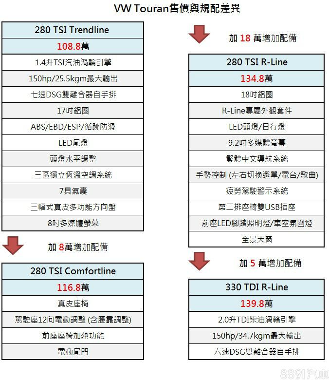 入門版本已涵蓋多數實用配備,而國人偏好的真皮座椅與實用的電動尾門,需到次階的280TSI CL以上才標配,至於配備最齊全的R-Line車型,擁有更動感的外觀、高階多媒體系統與全景天窗,並提供兩款動力選擇。