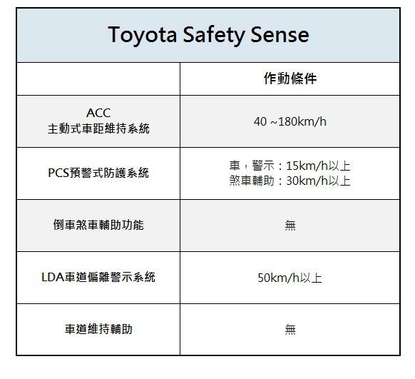 i-ACTIVSENSE同樣藉由雷達+鏡頭的方式偵測標的物,透過鏡頭偵測前車煞停、雷達調整ACC車距,也是少數具備倒車輔助煞停的系統,雖然作動時速範圍稍低,但也足夠使用,另外像是智慧型頭燈已屬此系統內範疇。