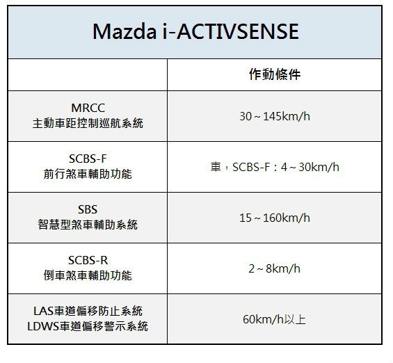 目前就CX-5、CX-9與Mazda 3具備完整的主動安全科技,而CX-3則有望藉由小改款加入MRCC的機能,整體來看,涵蓋的車款雖多,但可惜的是MRCC功能無法跟車到靜止。