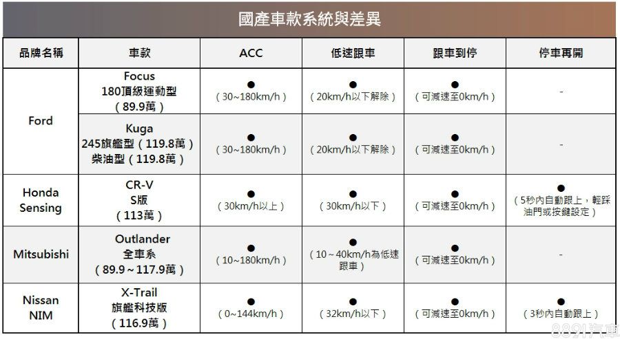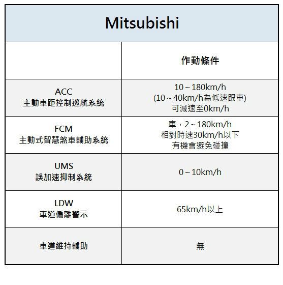 目前僅Outlander與Eclipse Cross具備相關項目,其中Outlander 91.5萬的安全型,則是休旅對手當中最易入手主動安全科技的車款,而Eclipse Cross則在頂規版才具備ACC+FCM功能。