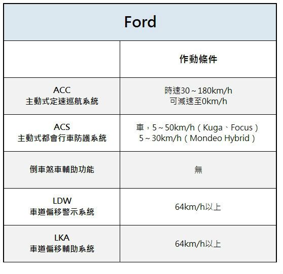 Ford旗下的Focus與Kuga,在國產車當中算是頗早搭載主動安全的車款,不過皆須在各自的頂規版才標配,而Mondeo車系則搭載於Hybrid車型。