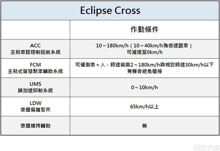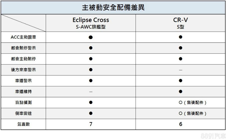 頂規的CR-V因具備ACC主動跟車+車道維持系統,已趨近半自動駕駛的程度,不過較Eclipse Cross缺少標配後方雷達與盲點偵測,且Eclipse Cross在基礎車型即具備7氣囊、FCM與車道偏移警示,使得兩車在搭載的項目多寡各有所長。