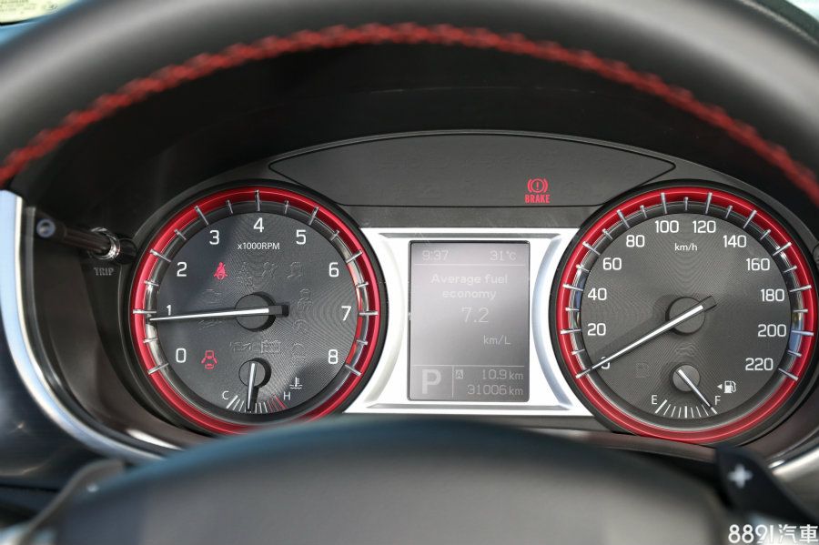 雙環儀錶周圍也有紅色飾條妝點,中央的行車電腦可記錄平均油耗與車速等,簡單易於辨識。