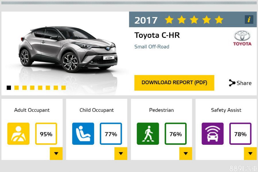 C-HR在成人乘客的撞擊測試得分達到95%,當中的小面積偏位、正面、側面撞擊項目都取得高分,但在後座的6歲兒童與10歲兒童部分,胸腔以及頸部的防護效果只有及格邊緣,另外在行人碰撞防護的表現,由於車頭造型的緣故,對行人骨盆位置的防護效果得分較低,至於主動安全輔助方面,AEB系統獲得高評價,但台灣引進的C-HR目前並未配置。