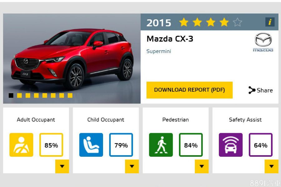 CX-3在成人乘客的防護成績只有85%,主要在正面撞擊項目中,後排乘客的胸腔受到較明顯的壓迫,因此防護效果僅得到「Week」評價,至於兒童乘客和行人防護都有正常水準的表現,值得一提的是,在安全輔助的部分,此份針對2015年車型的報告並未搭載AEB系統,但目前引進台灣的CX-3,在今年改款之後,從第二階的Sky-G頂級型(84.9萬元)便標配SCBS-F前行剎車輔助系統。