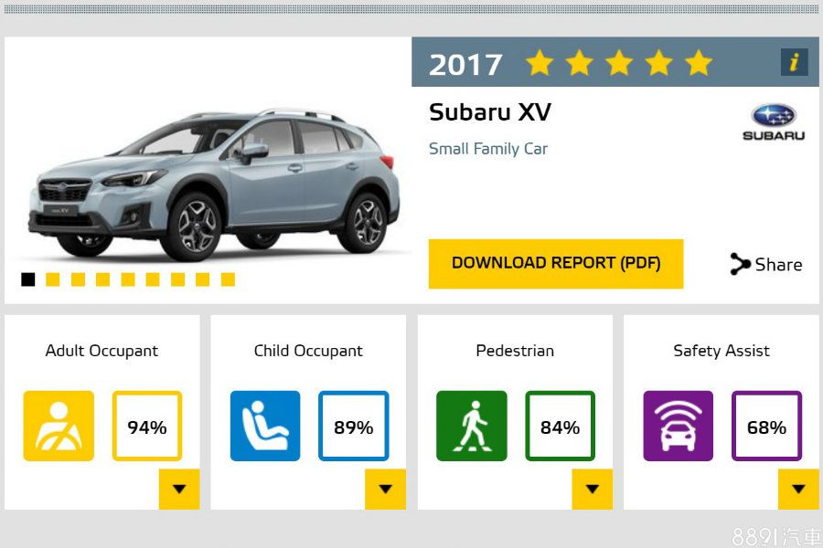 XV的成人防護效果有94%成績,不過後方乘客的骨盆部位防護得到最差「Poor」評價,另外在兒童乘客和行人的測試項目都是良好水準,但是主動安全系統的部分,因受測車輛缺少定速系統而影響評分,不過實際在台灣販售的XV,中階開始便標配定速功能,頂規則提供EyeSight系統,包含PCB主動碰撞預防、ACC跟車等功能。