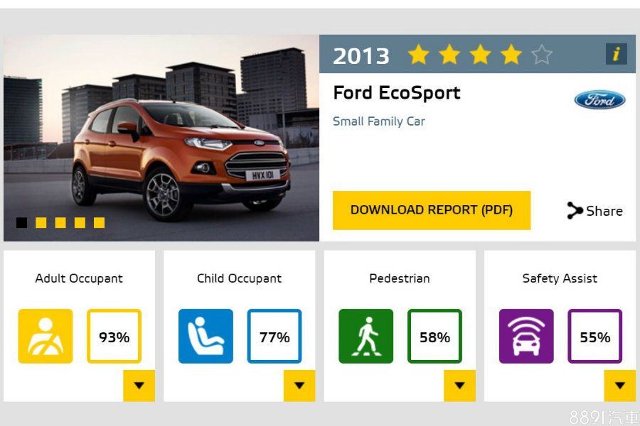 Ecosport的成人撞擊防護成績為93%,兒童撞擊防護的表現則和其他同級車種差不多,但是在行人碰撞防護和主動安全系統方面就比較薄弱,首先是行人遭撞擊時,引擎蓋前緣容易造成骨盆部位的傷害,主動安全則是因為沒有定速/限速與AEB系統,若以引進台灣的車型來看,頂規的125旗艦型標配定速系統,但同樣未提供AEB主動煞停輔助功能。