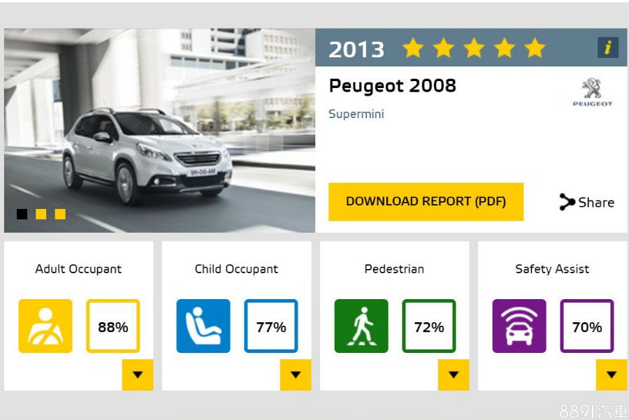 比起其他同級對手,2008在各項測試都獲得不錯的評價,從NCAP的評論中得知,不論是成人、孩童或行人撞擊防護都有不錯的安全表現,至於在主動安全方面,報告顯示因缺少車道偏移和AEB系統,所以得到不高的70%,但國內引進的車型其實都標配ACB主動煞停輔助系統。