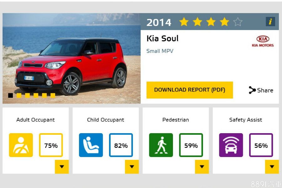 Soul在成人撞擊防護成績只有75%,明顯低於對手,遭扣分部分包含正面撞擊時的腿部防護,並且在小面積側面撞擊時,對於乘客的胸腔保護效果不佳,另外也能看到行人撞擊防護與主動安全項目都沒有好成績,反倒在孩童乘客的部分較優秀,拿到比對手更高的82%。