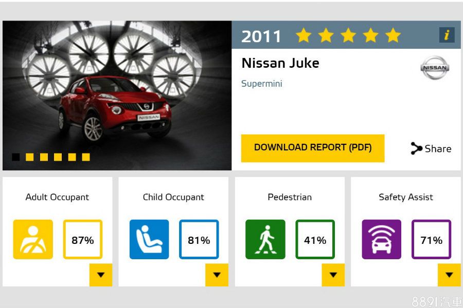 Juke不論是成人或孩童乘客的防護成績都不差,只有在正面撞擊時,乘客大腿的安全性只有及格邊緣,至於主動安全系統項目維持中規中矩的水準,比較需要官關注的便是行人撞擊防護的表現,只有41%,明顯低於其他同級車,NCAP的評論中提到,引擎蓋前緣對於行人較容易造成傷害。