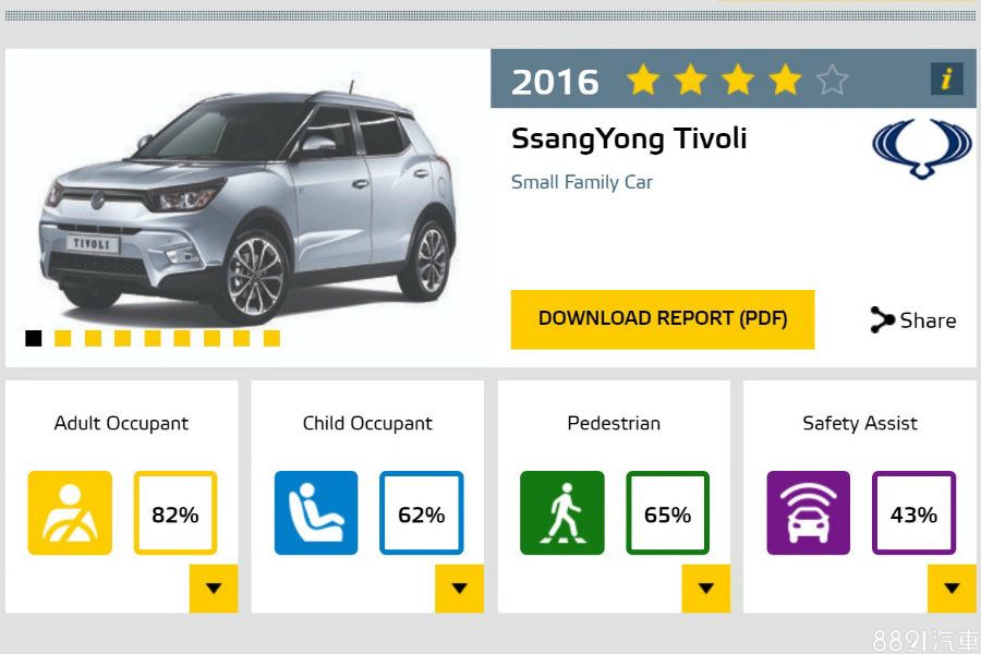 從報告上來看,Tivoli都是因為後座乘客的防護效果不足而遭扣分,包含成人的頭部與孩童胸腔在撞擊測試都受到傷害,行人撞擊的部分,則是在大燈上方的位置比較會讓行人受傷,至於安全輔助只有43%,原因則是因為缺少定速/限速與車道偏移輔助系統,但國內引進的版本除了入門車型之外,都擁有這兩項配備。