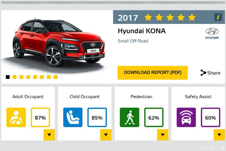 預計年底上市的Kona,目前確定先以進口方式販售,可以看到在成人與孩童乘客的撞擊防護效果良好,大致都有達到足夠的保護作用,只是對於行人撞擊防護與主動安全只能算差強人意,主要原因是AEB列為選配,進而影響到評比的分數。