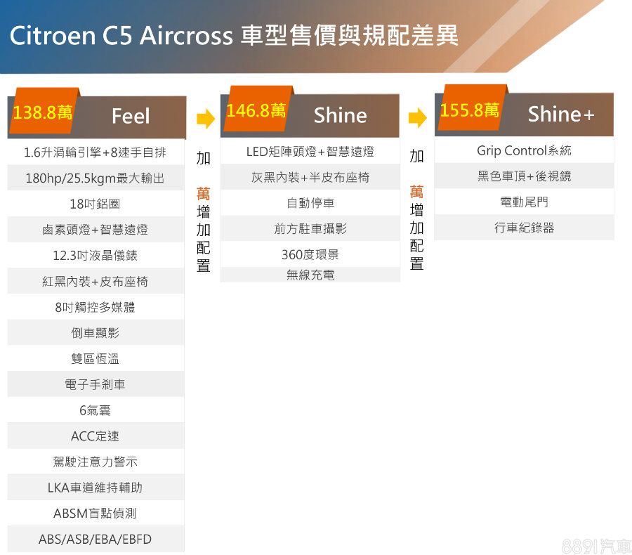 C5 Aircross引進三種配備規格,一率搭載1.6升渦輪引擎+8速手自排,此回試駕的是Shine版本,配備算相當完善,目前大家關注的主動安全防護,車道偏移主動修正、主動剎車輔助、駕駛人注意力警示、ACC智慧定速、自動停車系統均俱全。價格方面,入門Feel為138.8萬,Shine為146.8萬,至於頂規Shine+則開出155.8萬。