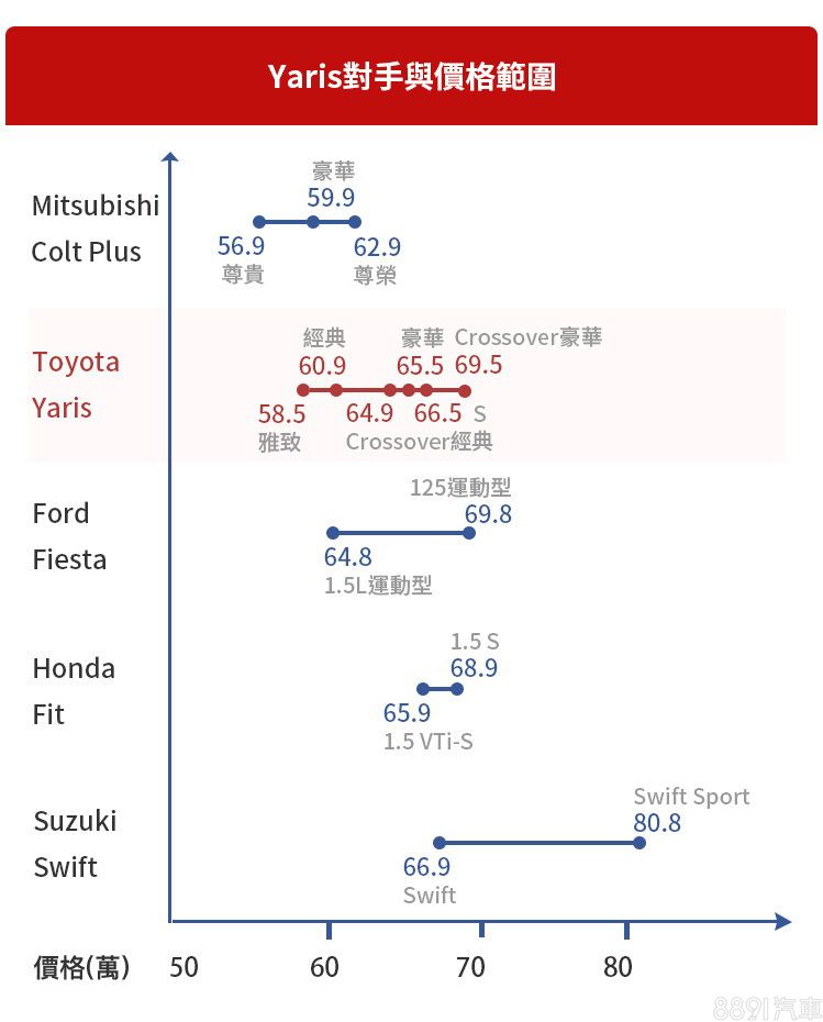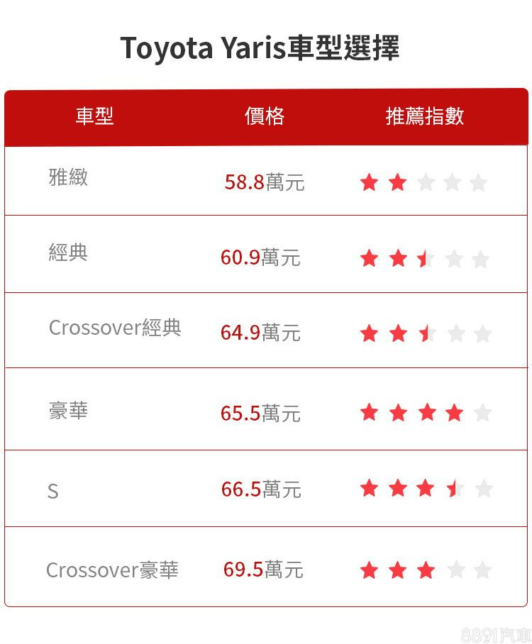 小改款Yaris車系共6車型編成,各車型間價差極小,在0.6~4萬之間,不過有跨界版、運動版等多元選擇,如何挑到自己真正需要的?加上經銷商的選配套餐,讓小鴨還是有機會變成破80萬的「肥鴨」,清楚各項配置細節對於有意入主的消費者來說還是很重要。