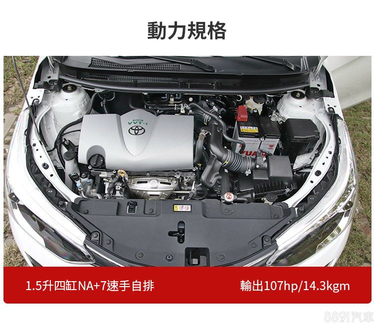 小改款Yaris全車系均持續搭載1.5升四缸自然進氣汽油引擎,最大輸出為107hp/14.3kgm,搭配的是可模擬7速前進檔位的CVT無段變速箱,雖說帳面上輸出不大,但市區內走走停停,動力表現輕盈順暢,很有豐田車給人一貫的印象「好開」~平均油耗表現惟入門的雅緻型為16.8km/L,其餘均為16.4 km/L。
