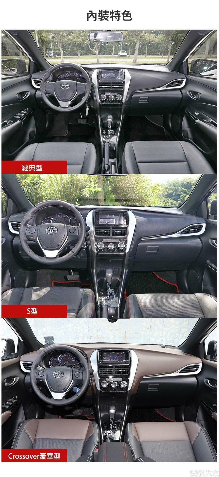 小改款Yaris外觀特徵比照泰規辦理,彷彿笑臉般的全新水箱護罩,加上放大的前氣壩、更加犀利的頭燈組,說實話個人認為車頭有點「怪異感」,反倒是換上新款尾燈組、線條趨於方正的車尾看起來順眼多了。S型除了擁有前霧燈、黑色車外後視鏡蓋、尾翼等配置,並在車身多處追加紅色飾條,突顯動感風格。至於Crossover則是透過較一般版加高30mm的底盤離地高度、專屬前後保桿、前下護板、車頂飾條,以及大面積防刮材質的運用,增添跨界氣息。