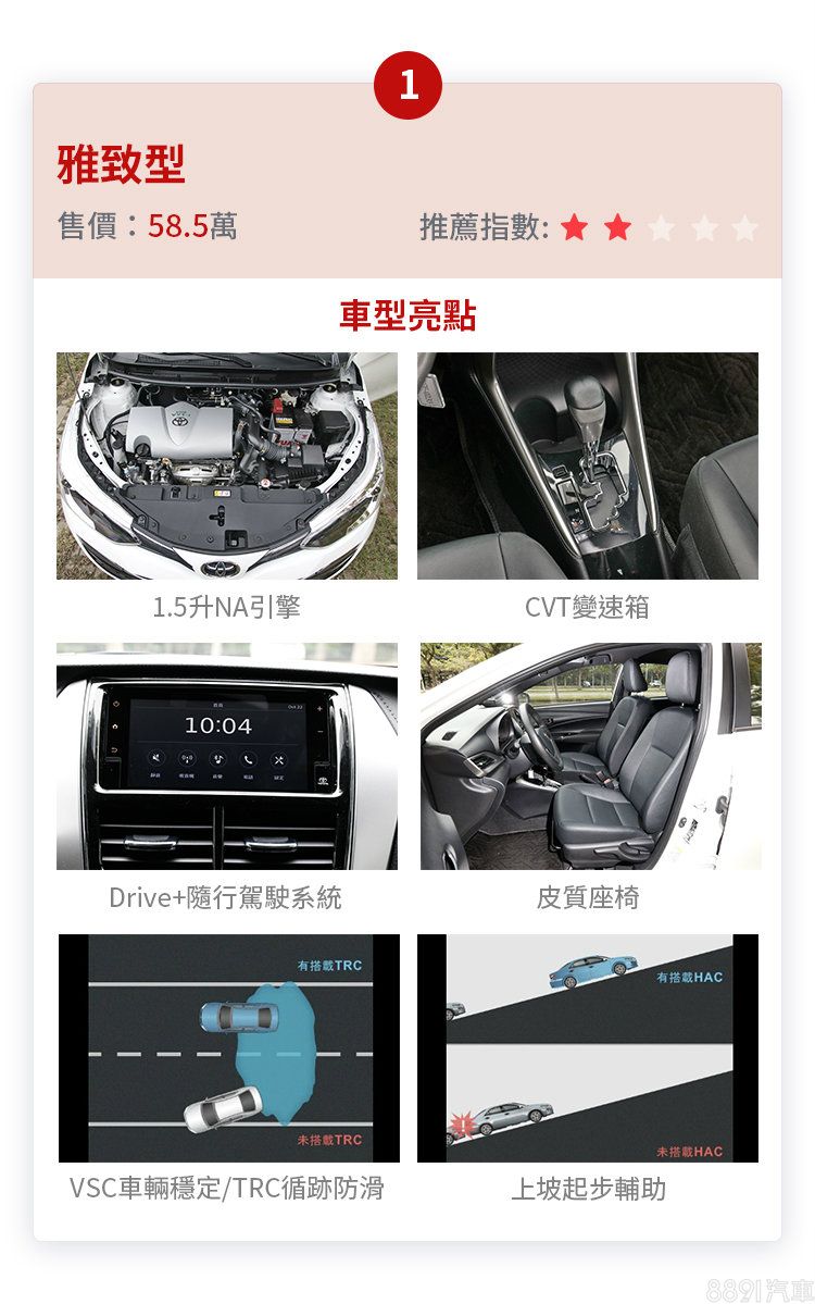 雖說與小改款前相比,在入手價增加了1萬的前提下,追加VSC車輛穩定控制、TRC循跡防滑等主動安全,但雅緻型配備就是標準的入門款(陽春),2具氣囊的配置依舊不行,不過擁有皮椅這項配備倒是挺貼心(方便好清理),若加上品牌維修方便、妥善率高的考量,比較適合「錢包小」又想找代步車的買家,或是公司行號租賃業者。