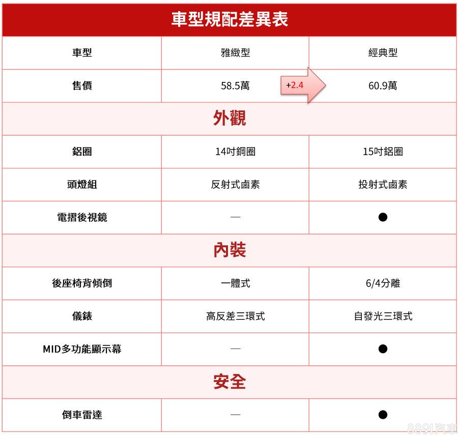 加2.4萬到了二階的經典型,除了較「有模有樣」的15吋鋁圈,主要多的是能讓你使用上多點便利的配備,包含自動收摺後視鏡與後座6/4分離設定等,不過在主被動安全沒有顯著升級的配置下,推薦指數仍不高。