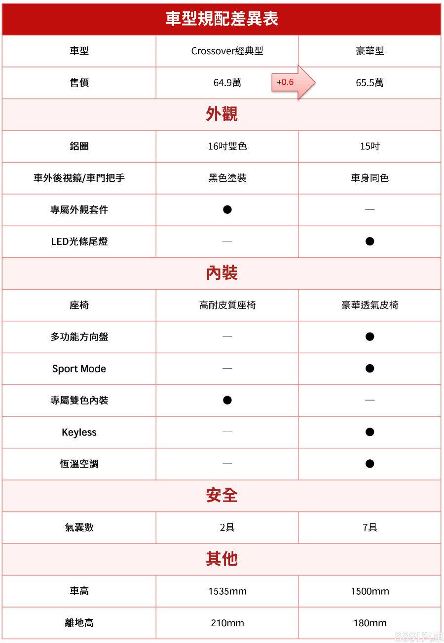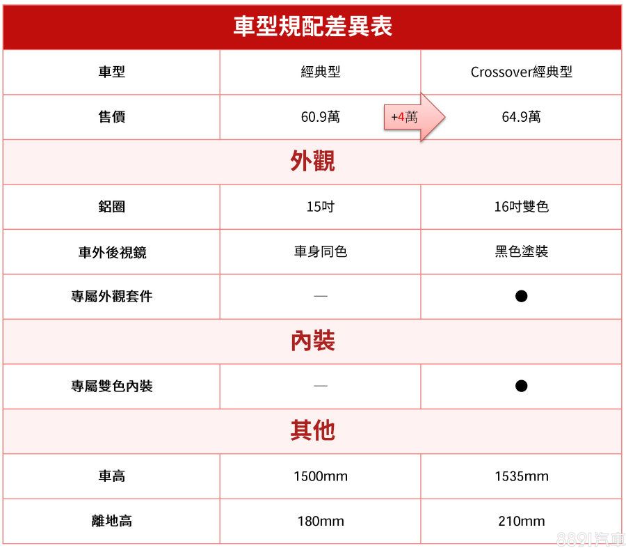 經典型與Crossover經典型間的4萬價差,都是落在專屬外觀內裝的配置上,16吋雙色鋁圈、外觀套件與雙色內裝的妝點,可以讓你多點與眾不同的虛榮感,至於多了30mm達210mm的離地高設定,搭配「跨界」形象意味濃厚,了不起就是在遇到坑坑疤疤的路況時,能比較安心,強化地形適應力什麼的倒也不至於,4萬換個外觀跨界感值不值?只能說見仁見智。