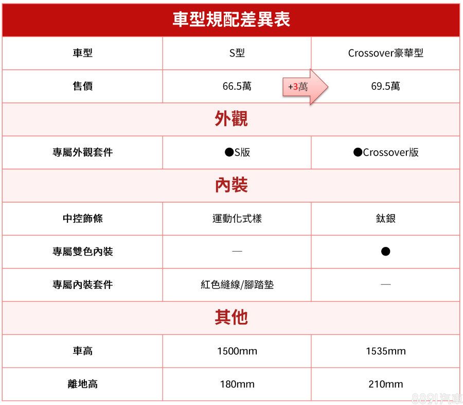 頂規的Crossover豪華型,除了先前提過的專屬外觀內裝設定,其餘配備均與S型相同,多3萬多的是外觀跨界感,除非你「就愛這味」,不然計較如我,是「跨」不過去啦…畢竟3萬拿來改改避震、開起來更符合自己心意、也更實在。