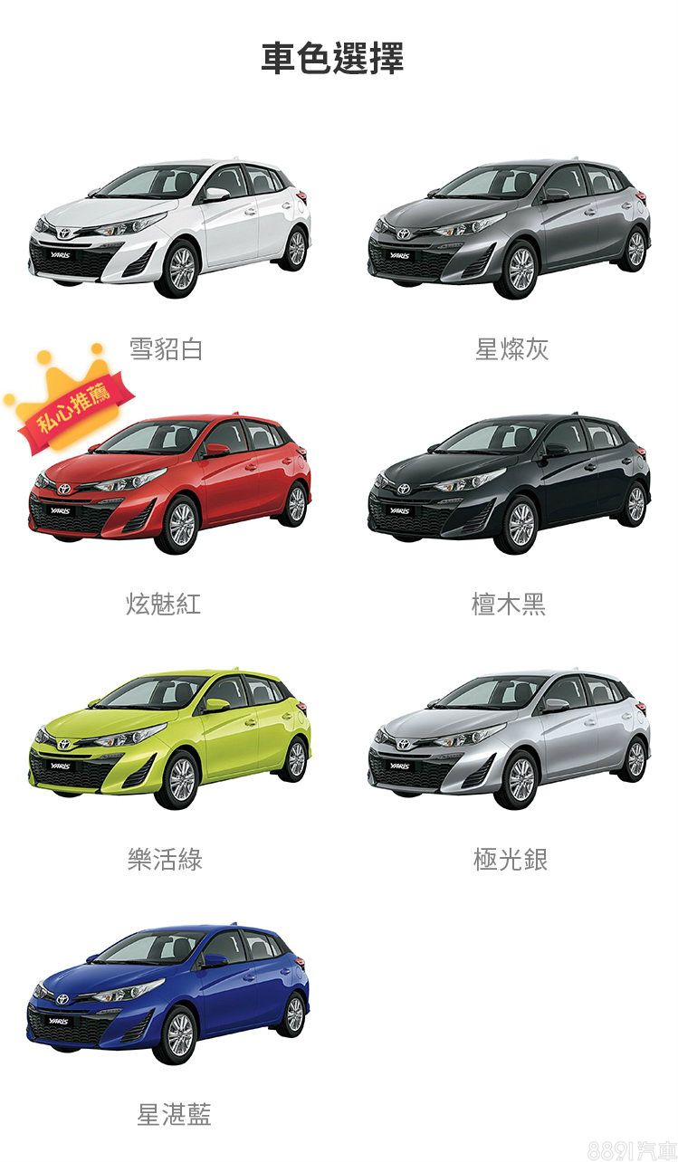 車色選擇方面,惟Yaris Crossover僅提供炫魅紅、星湛藍、雪貂白、星燦灰4種塗裝,並可加價1萬元搭配黑色車頂,其餘版本均為6種選擇。