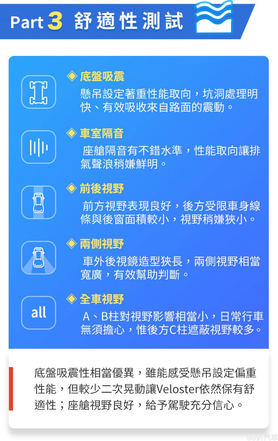 至於跑車基因這件事,確實可從頗低的車高看出端倪,進出車室也比較需要「鞠躬彎腰」,不過,後座空間仍是合宜,可以讓兩位成人安然入坐。Veloster定價115.9萬,從性能、產品定位來看,我們覺得沒有直接對手,若你在找尋120萬價格帶的個性化性能車款,從我們實測的各項數據來看,Veloster確實值得推薦!