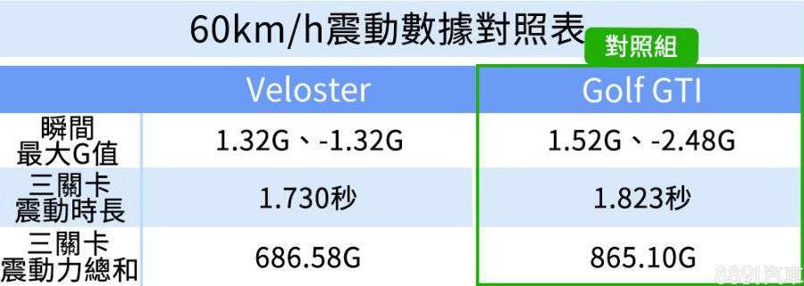 我們同樣對比Golf GTI數據,60km/h整體特性與30km/h相當,Veloster瞬間最大G值、震動力總和都較小,同時振動時長又更短,很顯然的,Veloster底盤吸收震動能力良好!