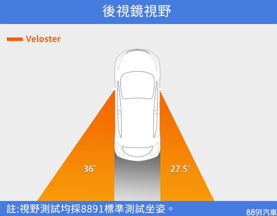 後方視野則受限於較小的尾窗面積,視野盲區17.2m,還好Veloster配有倒車顯影與後方雷達,能夠彌補這項小缺點。
