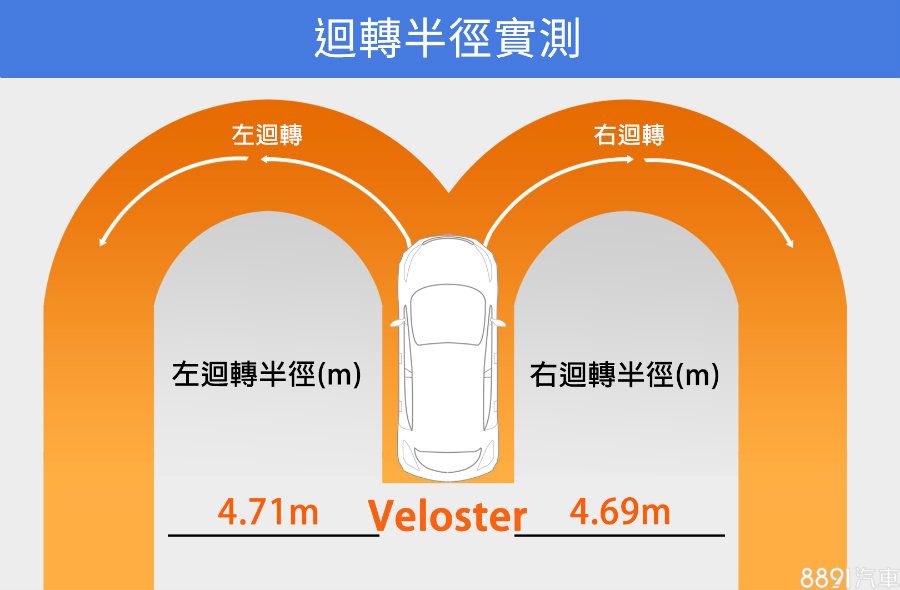 實際量測迴轉半徑,Veloster左右轉表現在同尺碼車款中都屬合理範圍,比起原廠公布5.3m數據要略小一些。