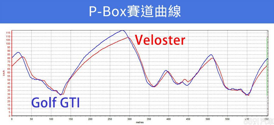 Veloster最後跑出42.5秒的單圈紀錄,雖然略慢Golf GTI的42.2秒,但將兩車P Box速度曲線疊在一起可以發現,Veloster彎中速度可不比Golf GTI遜色,甚至有略高於Golf GTI的情形,但礙於引擎排氣量、動力輸出都較小,使得出彎加速不如Golf GTI。
