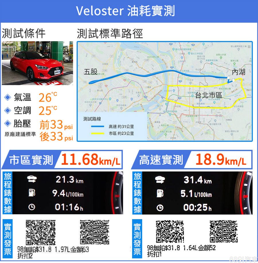 縱然有著204hp最大馬力,Veloster的油耗表現卻不會令人失望,市區油耗實測成績來到11.68km/L,高速油耗更是來到18.9km/L的亮眼成績,測試當天車流還算順暢,歸功於七速DCT雙離合器變速箱的換檔邏輯與傳輸效率,作為日常通勤用車油耗顯然足夠讓人滿意。