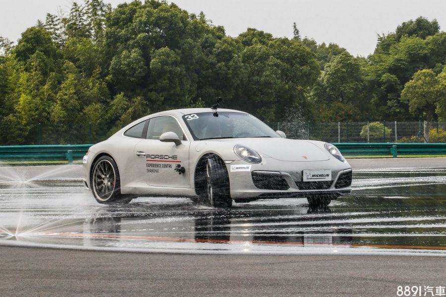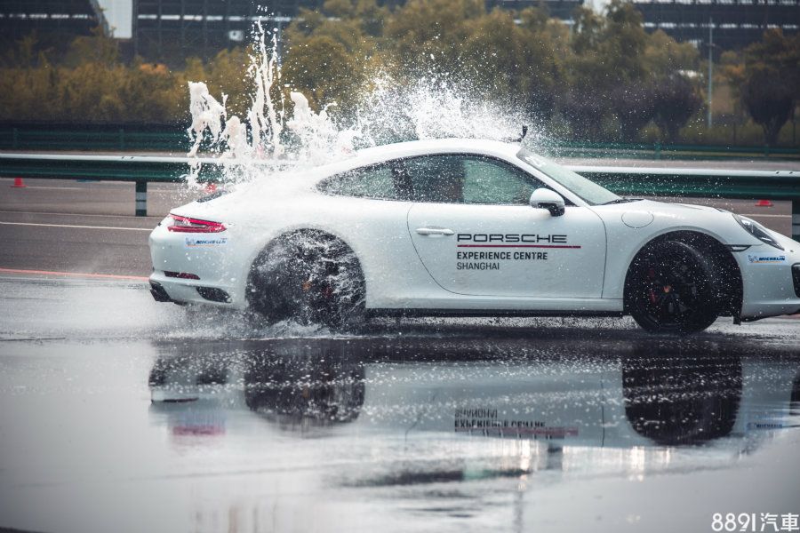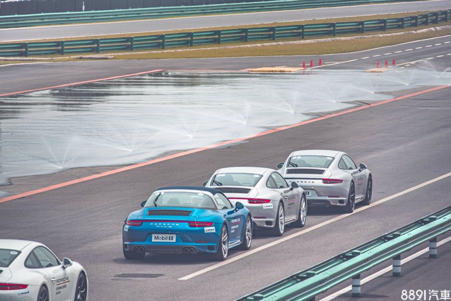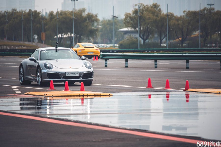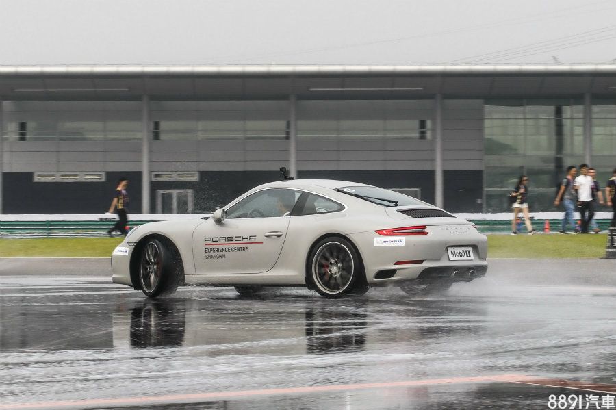 在溼地裡駕駛911定圓甩尾算是難度最高的一堂課,由於柏油路面經過設計,灑水後極為滑溜,要維持穩定的甩尾繞圈有一定難度,油門控制細膩度與方向盤掌握是關鍵。
